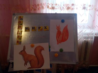 Матеріал і обладнання: білий папір А4,пензлики,серветки,стаканчики з водою, підставки під пензлики, картинка білочки, художнє слово, фарби помаранчевого кольору і фломастери зеленого та коричневого і чорного.