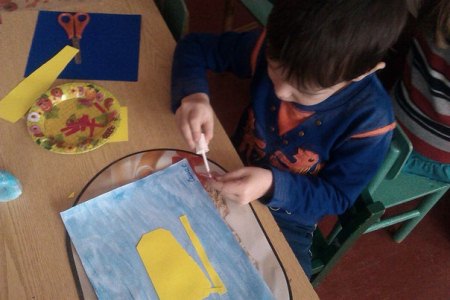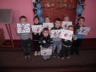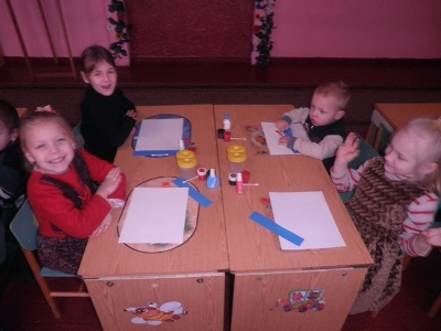 -закріпити вміння правильного користування пензликом та фарбами, навчити новому прийому в аплікації із рваних частин паперу, та нетрадиційному прийому в малюванні- малюванню лодонями.