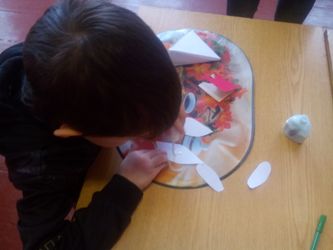 Матеріал і обладнання : пензлики, фарби чорного та червоного кольорів, серветки, смужка блакитного паперу, пластилін червоного кольору, досточки для ліплення, клей.